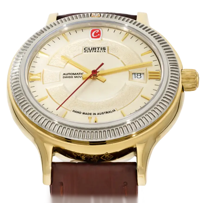Australian made by us, with a choice of two tone stainless steel bracelet or leather band, combined with a choice of five different dial options. The leather band is fitted with a convenient deployment clasp for quick and easy on and off. The gently curved case makes for a comfortable fit, while the three step crown makes your Motima RT easy to adjust, including a convenient quick change date feature. It’s secure too – the robust solid gold screw down / lock down crown mechanism protects your watch.